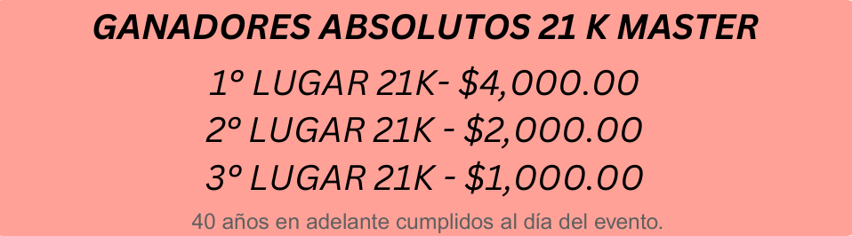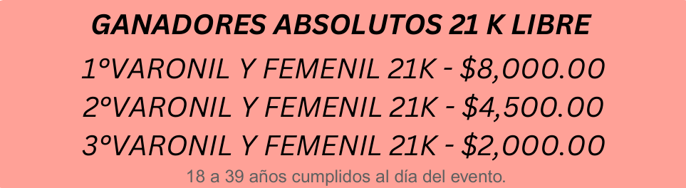 DISTANCIAS: 21K (21,097.5mts), 10K, 5K y 1K Infantil (recreativo).